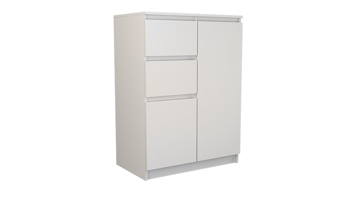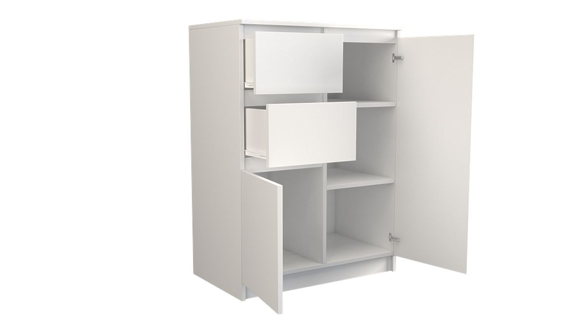 Vnitřek komody se skládá z polic a dvou zásuvek, které pomohou s uspořádáním věcí. Snadněji najdete to, co hledáte.