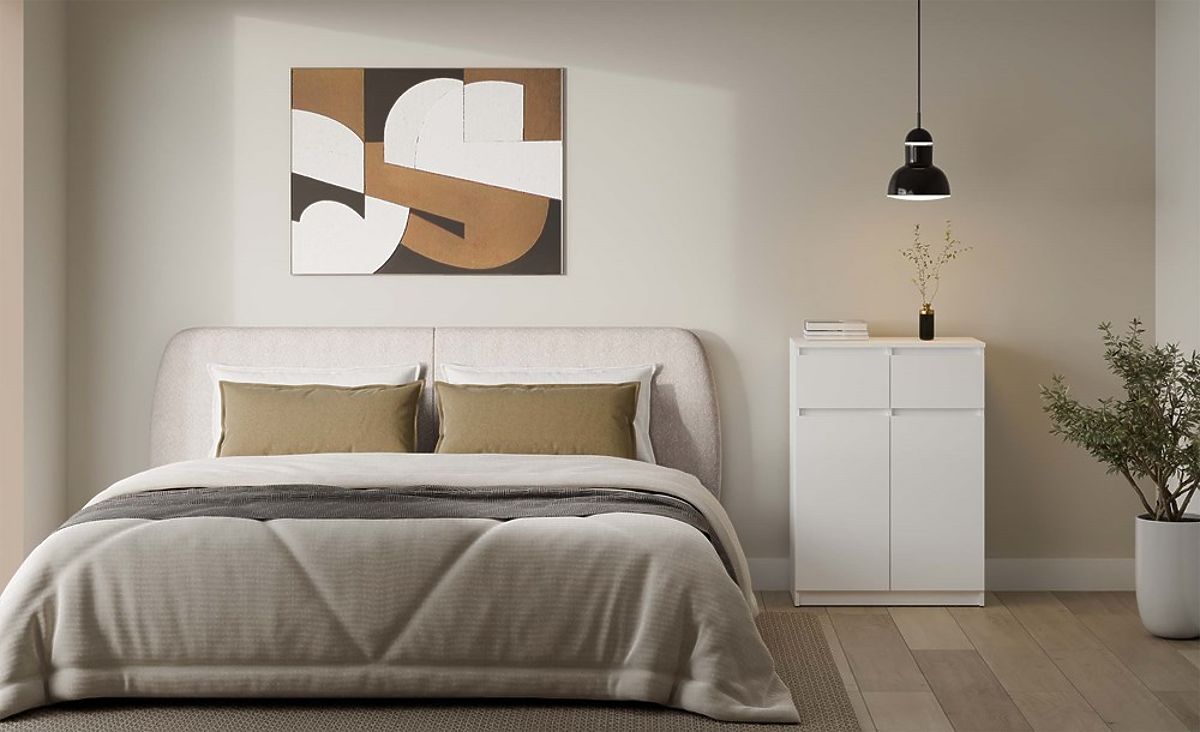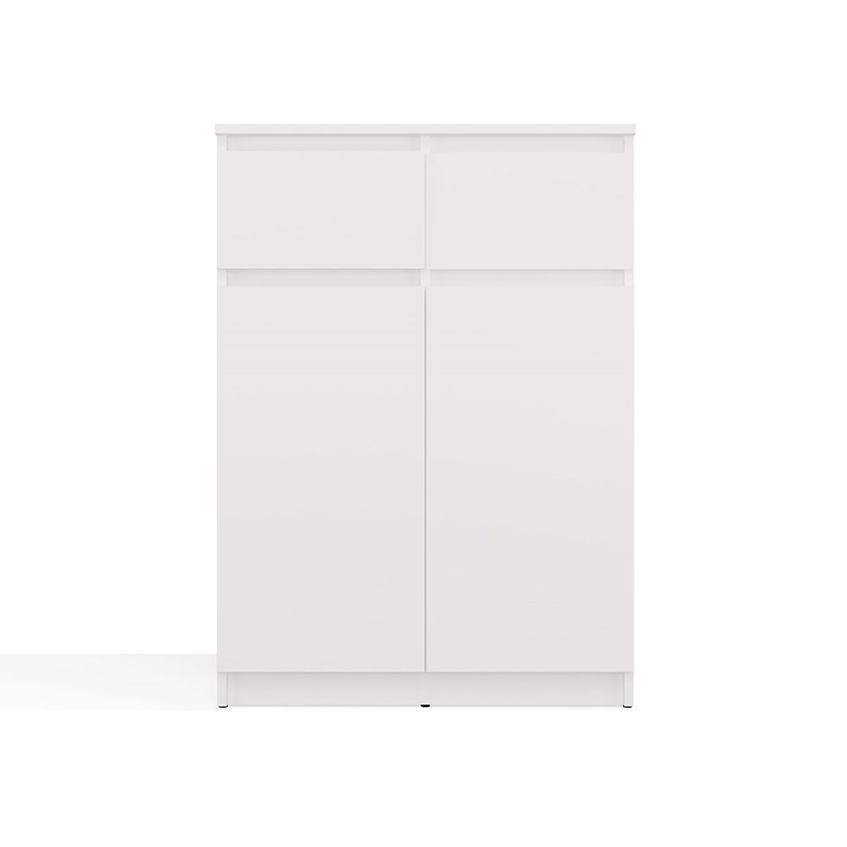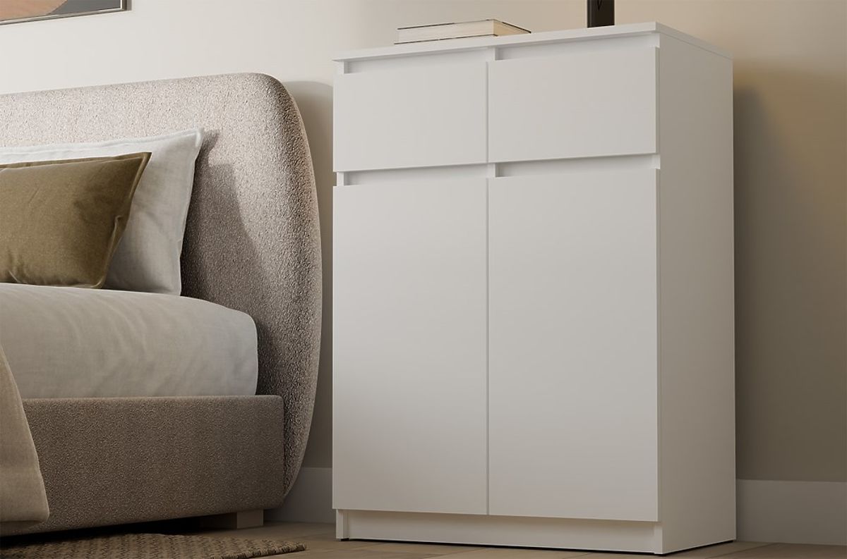 Bílá komoda 2DD2S s dvěma dveřmi a zásuvkami pro různé interiéry. .. více