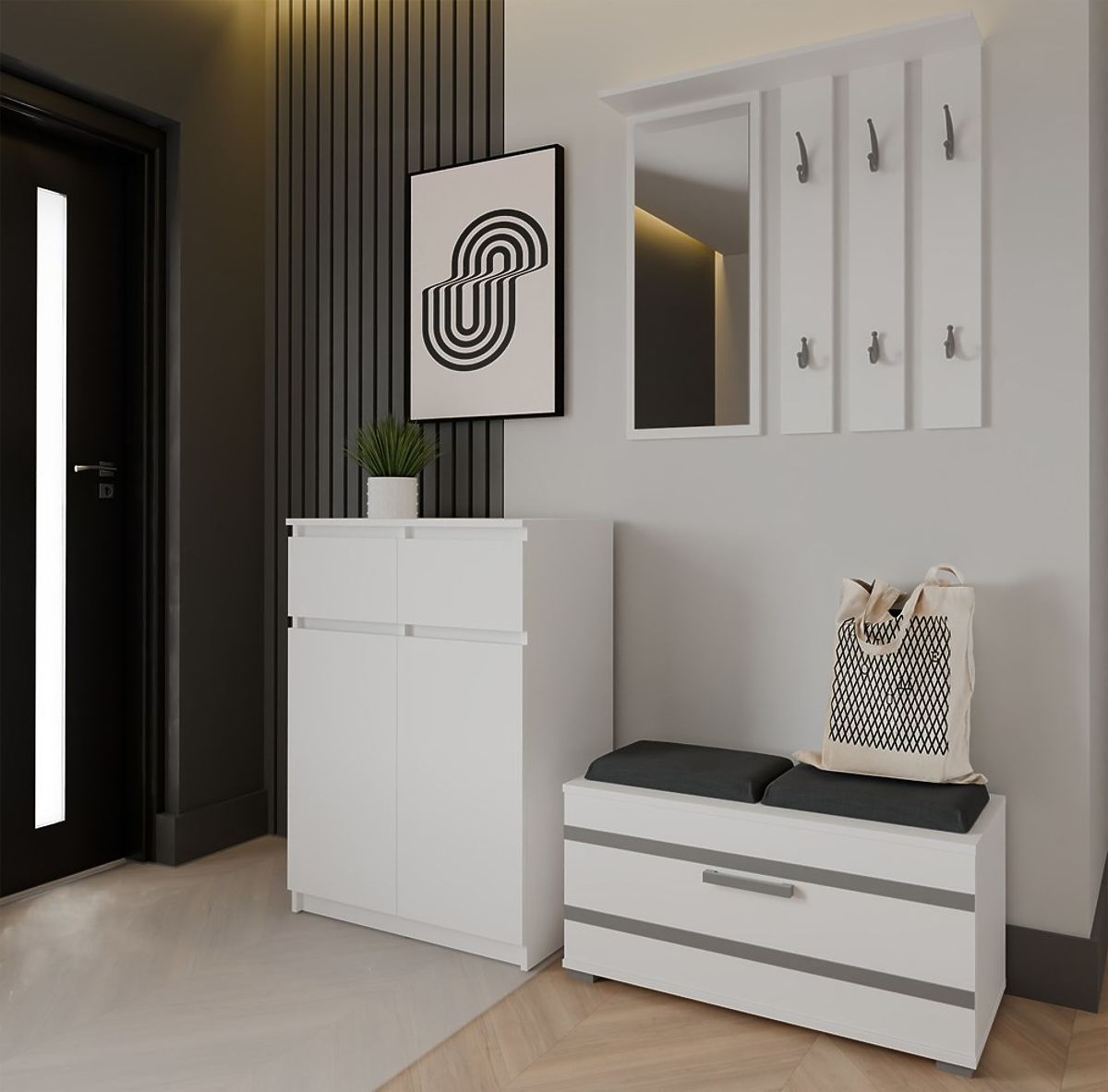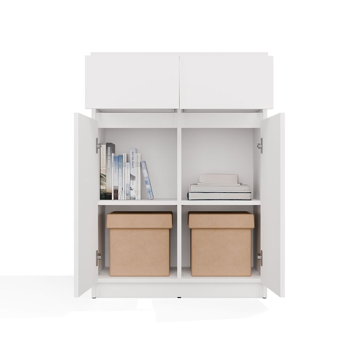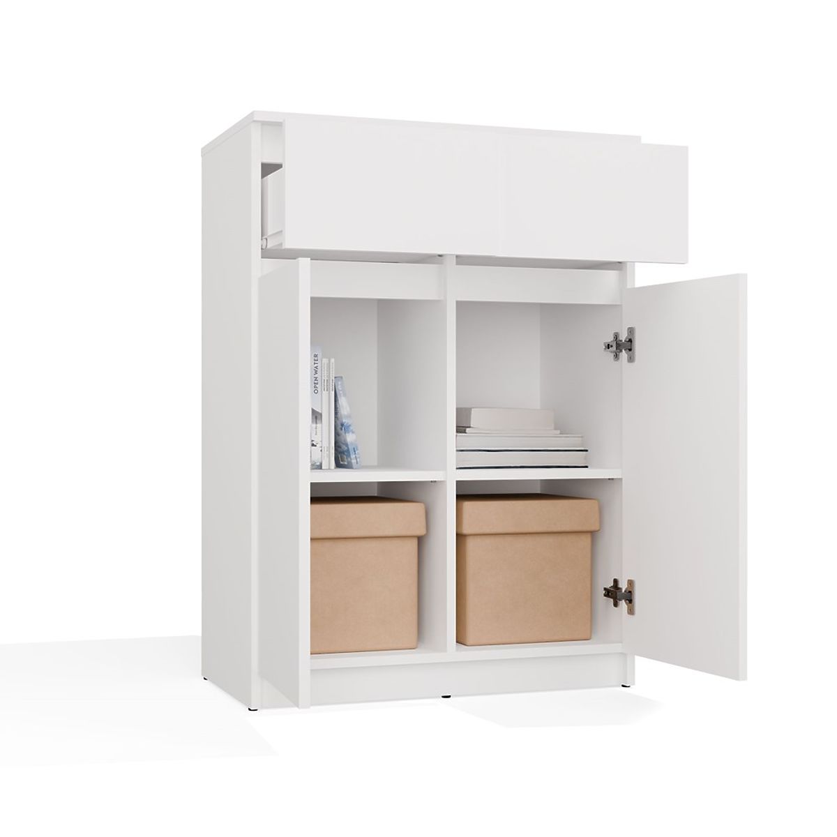 Bílá komoda 2DD2S s dvěma dveřmi a zásuvkami pro různé interiéry. .. více