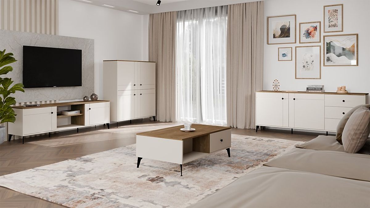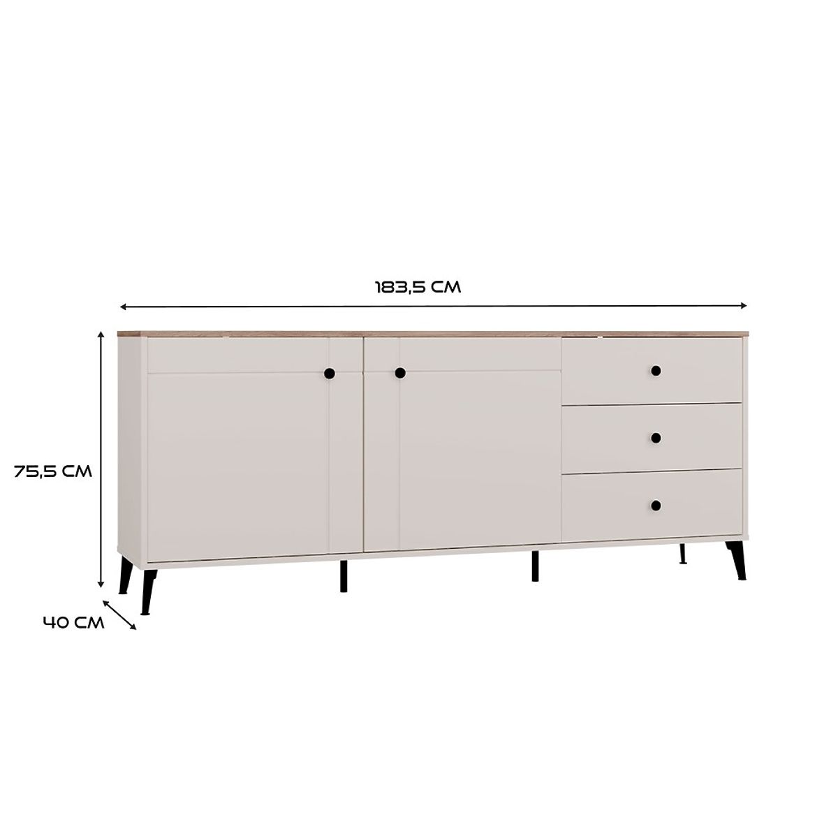 Komoda POINT 2D3S z moderní kolekce Point kombinuje eleganci s funkčností. Dokončená v módní barvě kašmíru s kontrastní deskou v dekoru Dub Castello, perfektně zapadne do moderních, skandinávských a klasických interiérů.