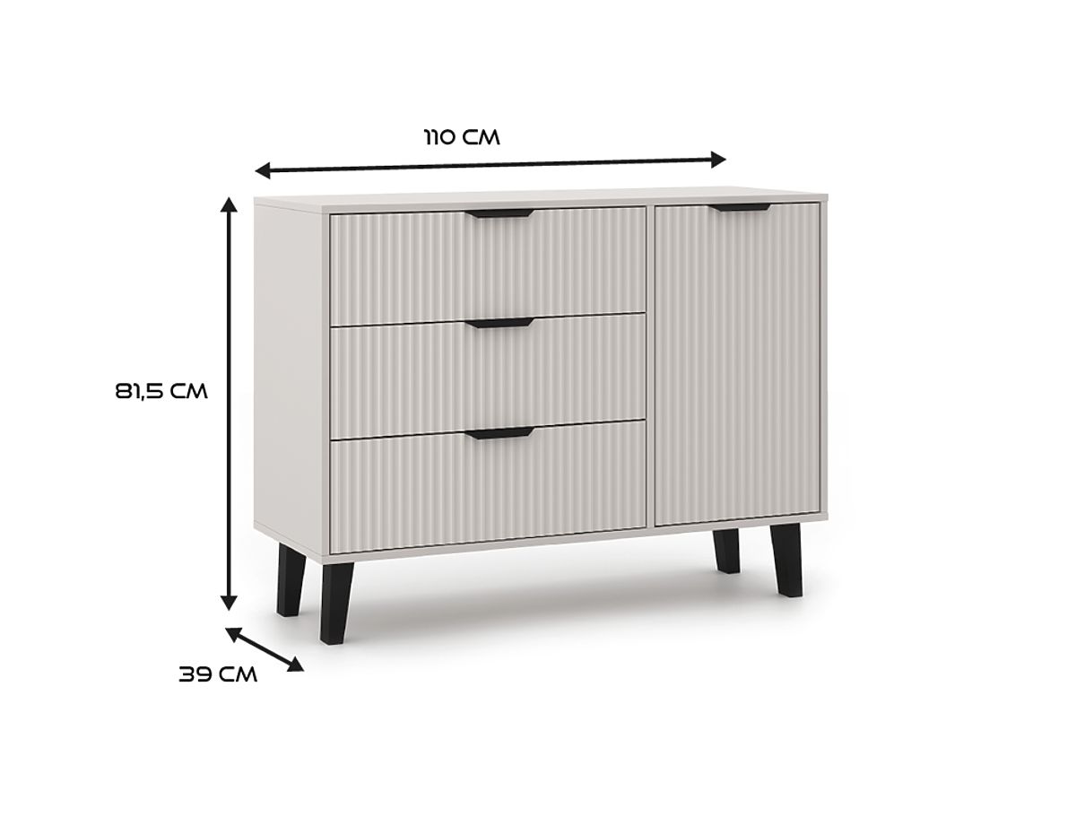 Čela dveří a zásuvek jsou zdobena elegantním drážkováním, které dodává nábytku charakteristický vzhled inspirovaný lamelami. Celek doplňují černé úchyty a vysoké, černé nožky, které nábytku dodávají lehkost a výjimečný styl.