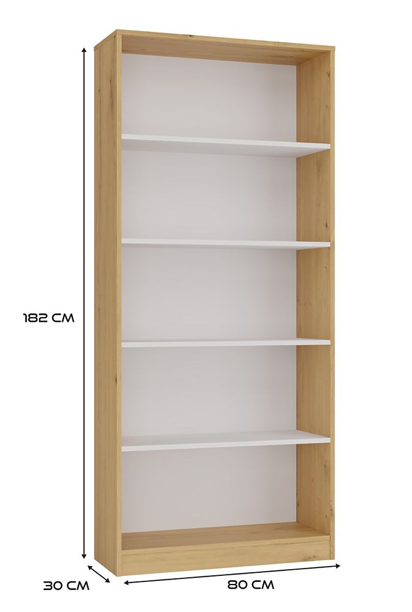 Regál R80 je stylové a praktické řešení pro ukládání knih, šanonů, dekorací a kancelářských materiálů. Spojení teplého odstínu dubu artisan s kontrastními bílými policemi dodává nábytku moderní a elegantní charakter. Skvěle se hodí jak do kanceláře, obývacího pokoje, dětského pokoje, tak i do domácí knihovny.