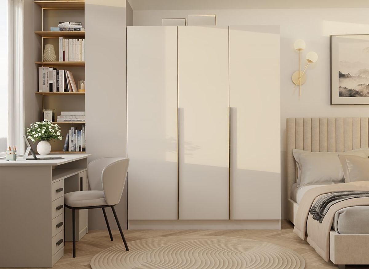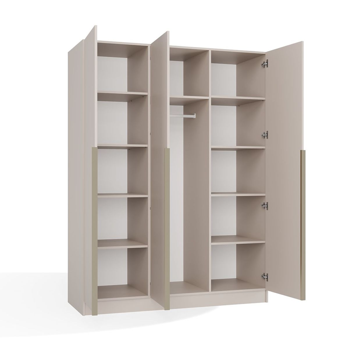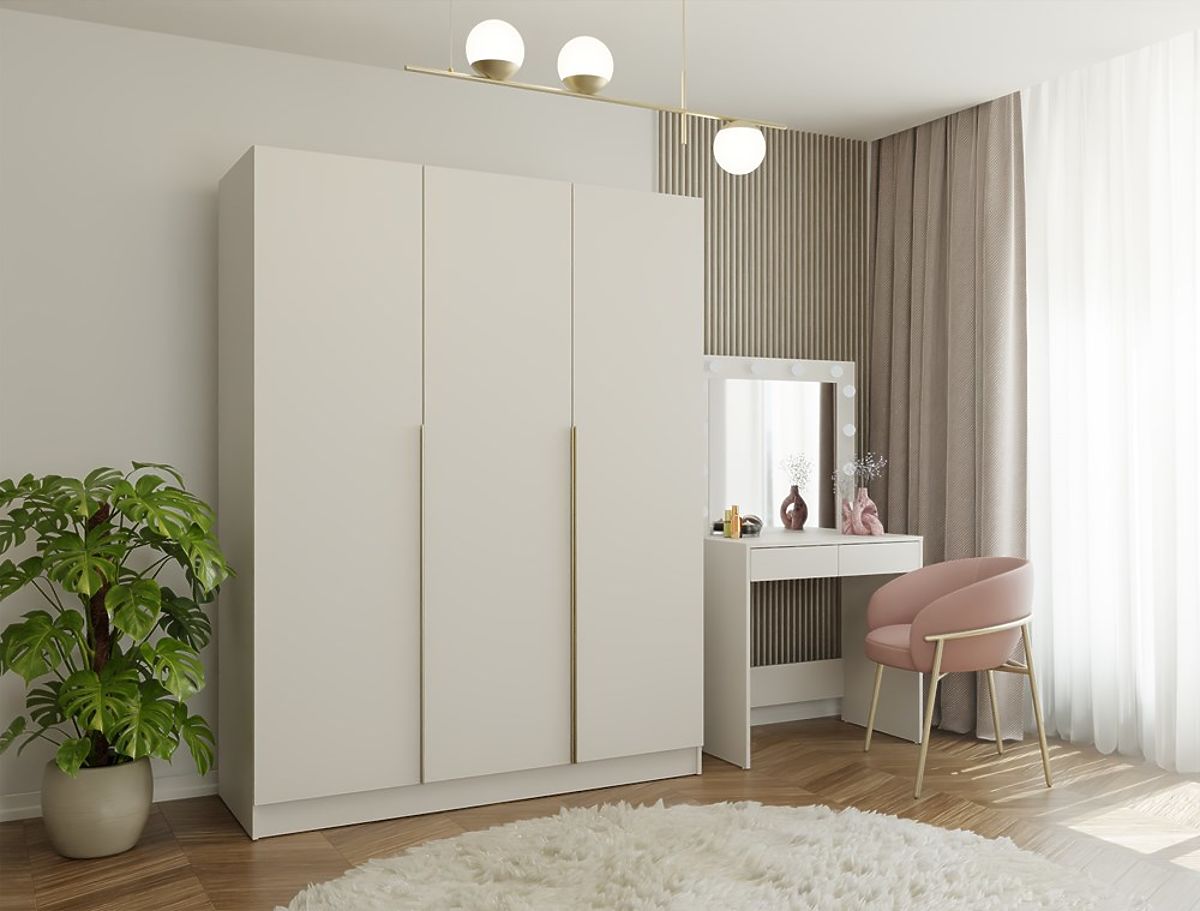 Pokud hledáte kombinaci minimalismu, elegance a výjimečné funkčnosti, skříň SENSO 3D je právě pro vás. Tato třídveřová skříň zaujme jednoduchou formou, matným povrchem v barvě kašmíru a charakteristickými zlatými úchyty v odstínu kartáčovaného zlata, které podtrhují její luxusní charakter.