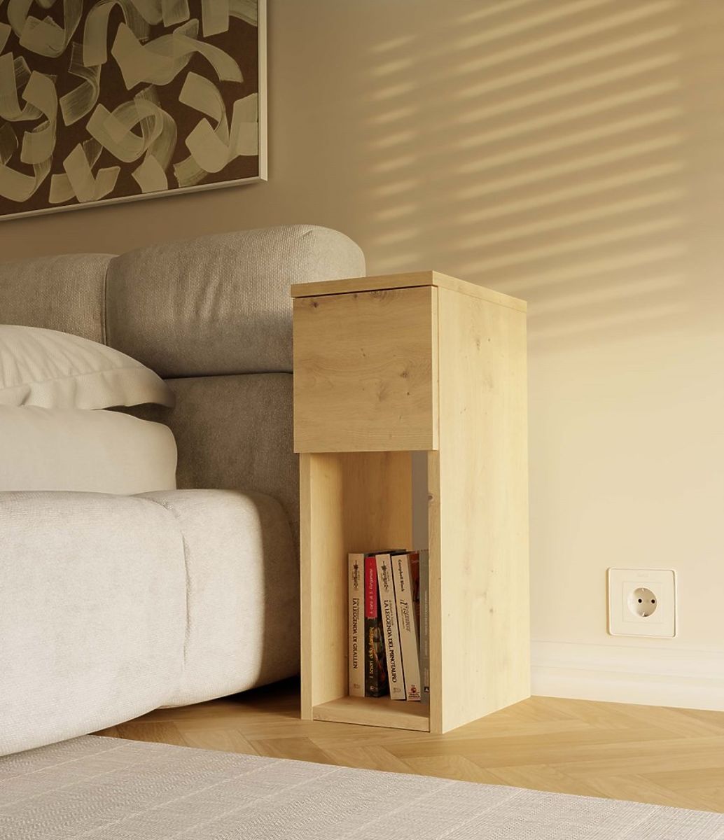 Noční stolek GALAX 20 1S je praktickým a estetickým doplňkem každé ložnice. Vybaven otevřenou policí a zásuvkou, skvěle poslouží jako místo pro knihu, telefon, nabíječku nebo jiné předměty, které chcete mít vždy po ruce.