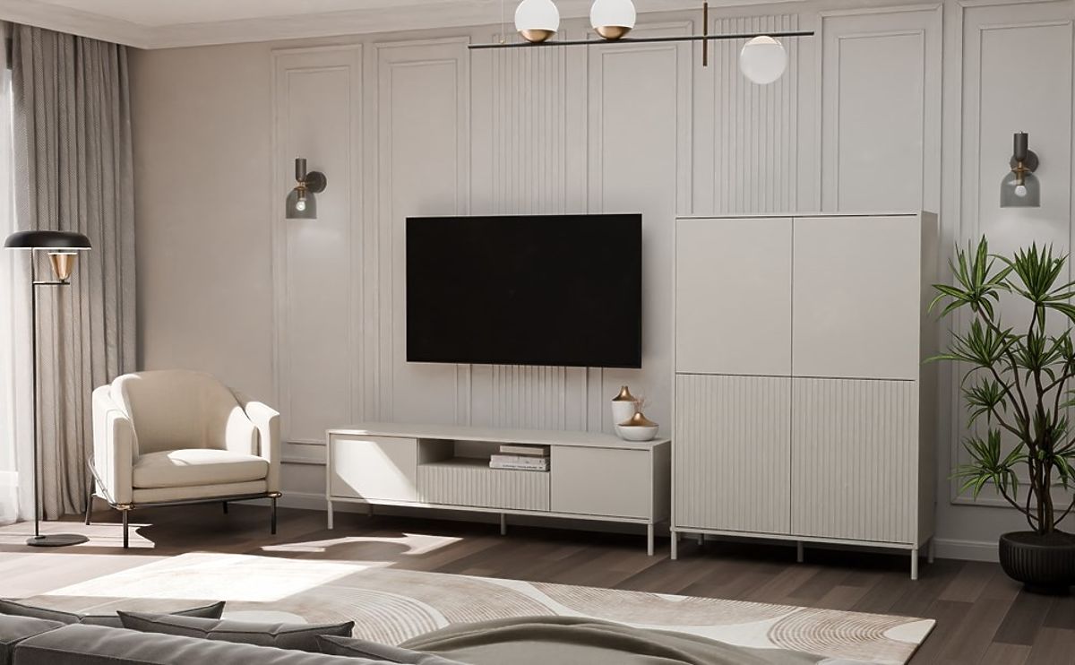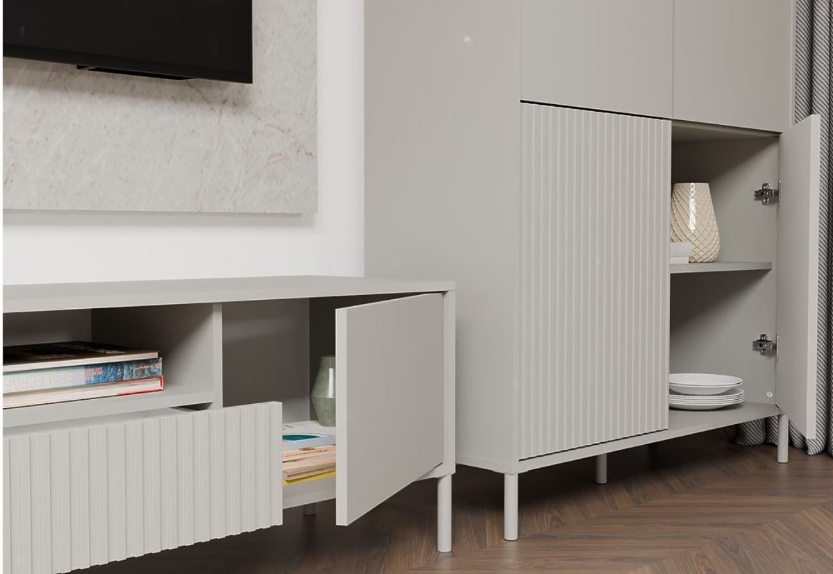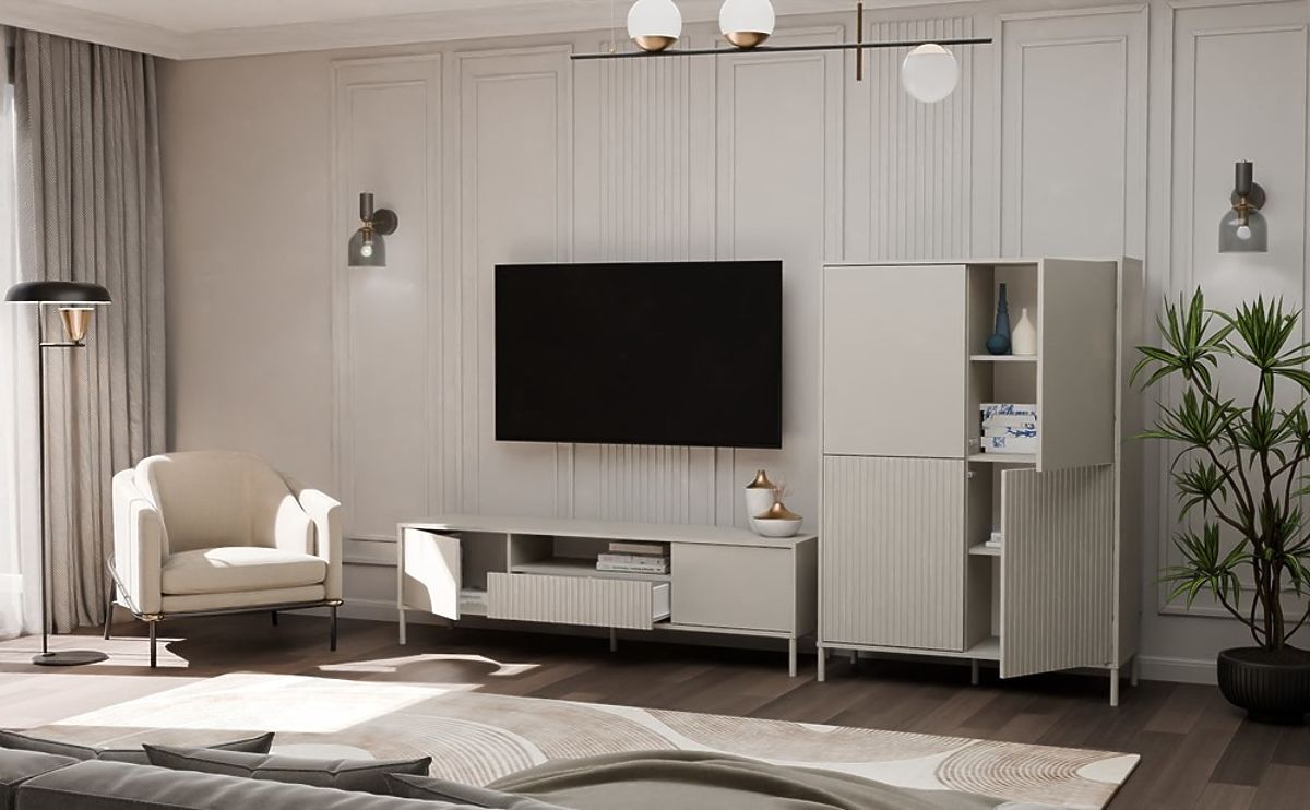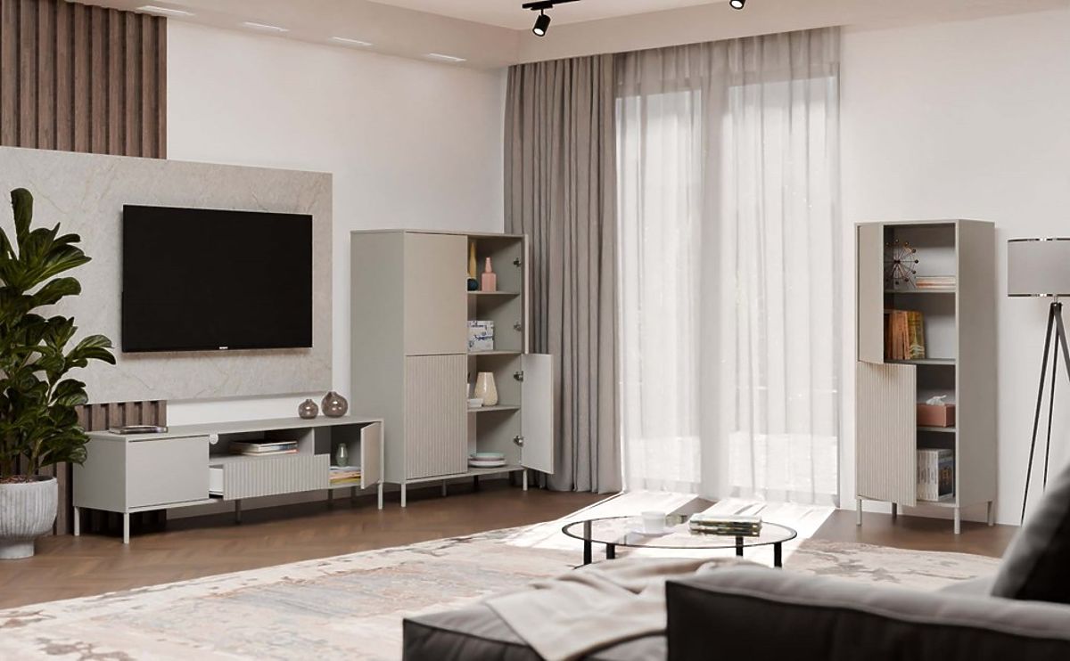 Povrchová úprava nábytku v moderní barvě Kašmír (elegantní odstín béžové) dodává interiéru eleganci a současný charakter, přičemž si zachovává neutralitu, která se snadno hodí do různých dekorativních stylů