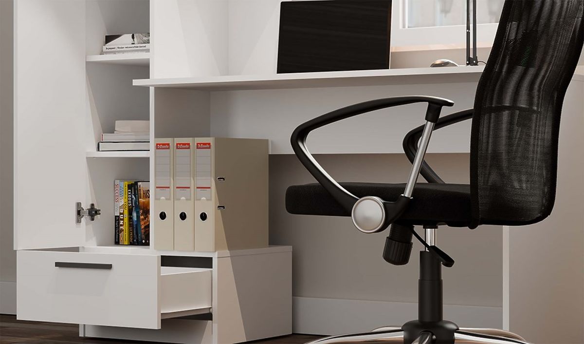 Promyšlené řešení 2v1 – psací stůl a regál s uzavíratelným úložným prostorem