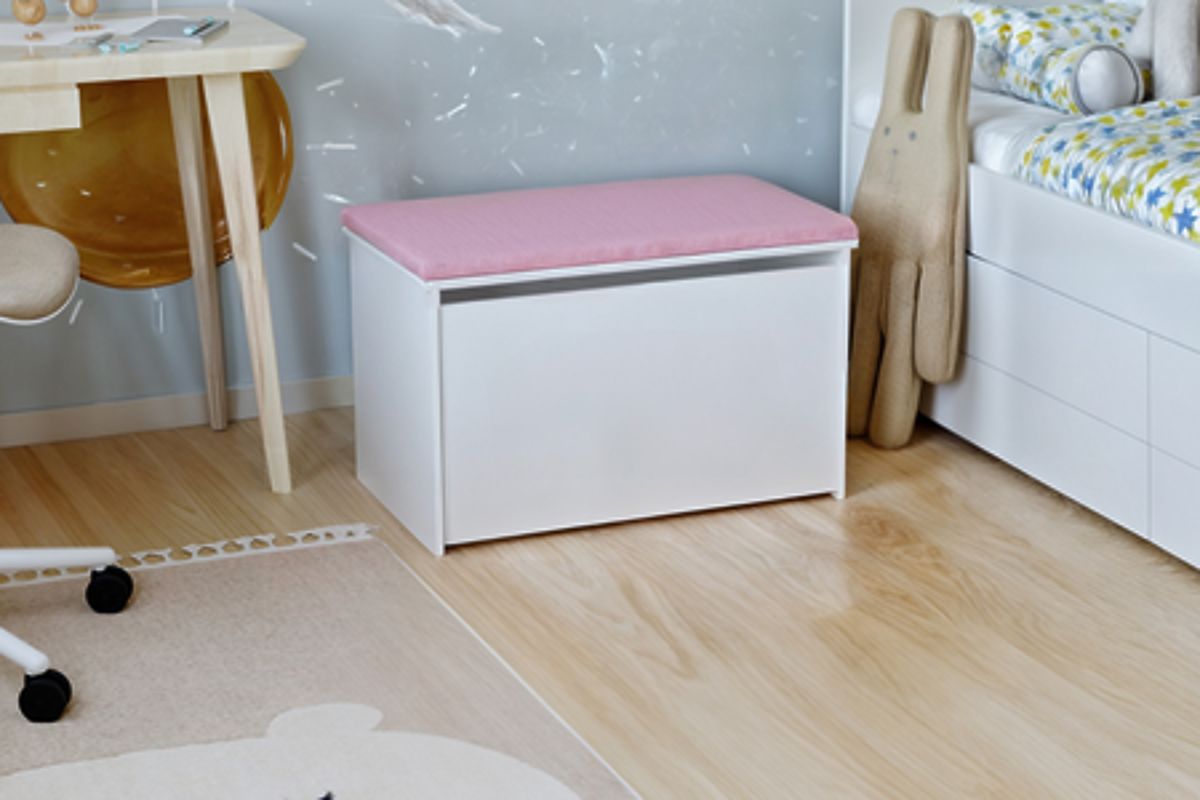 Stylová truhla na hračky s růžovým sedákem a prostorným interiérem. .. více