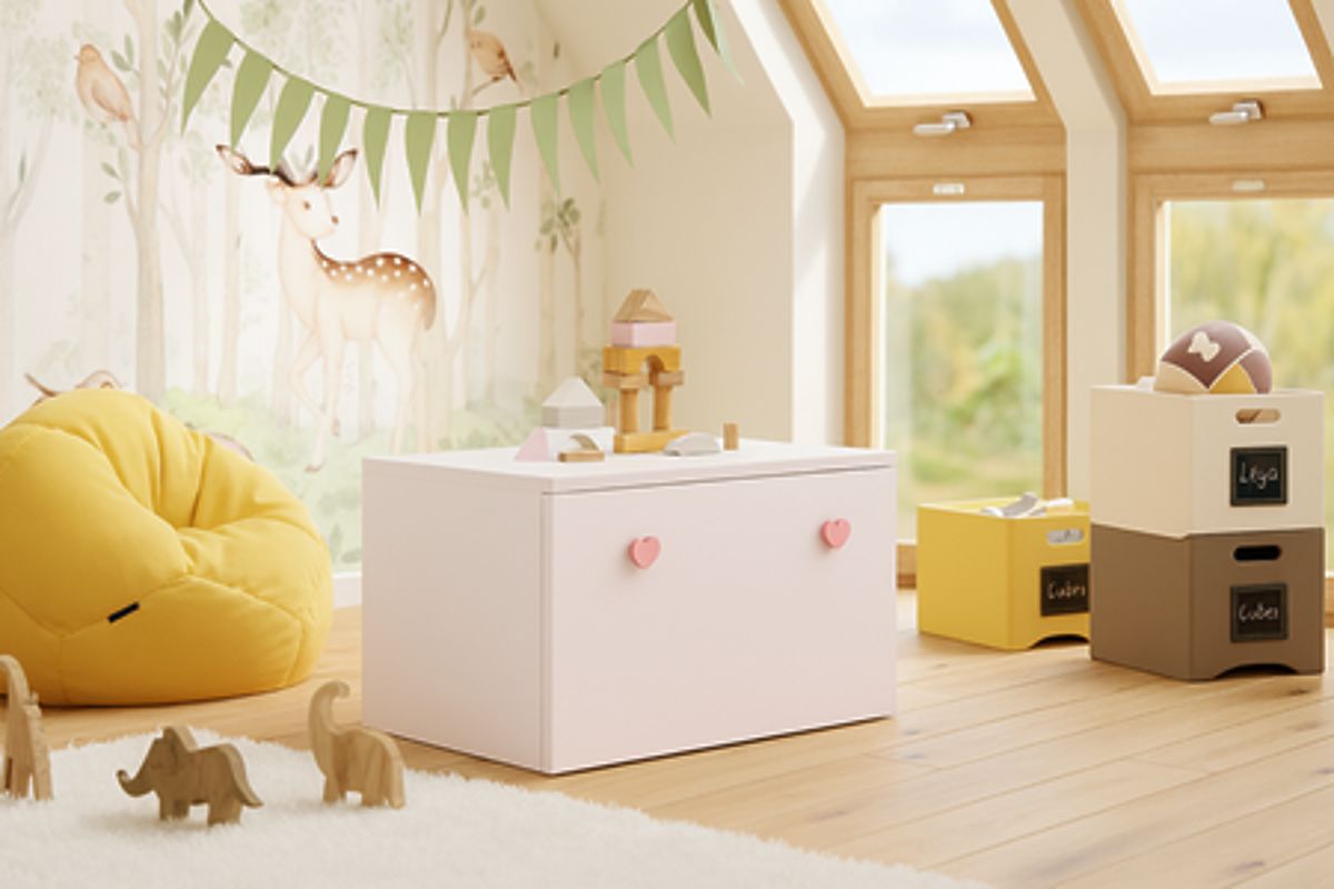 Prostorná truhla na hračky s moderním designem a růžovou rukojetí. .. více