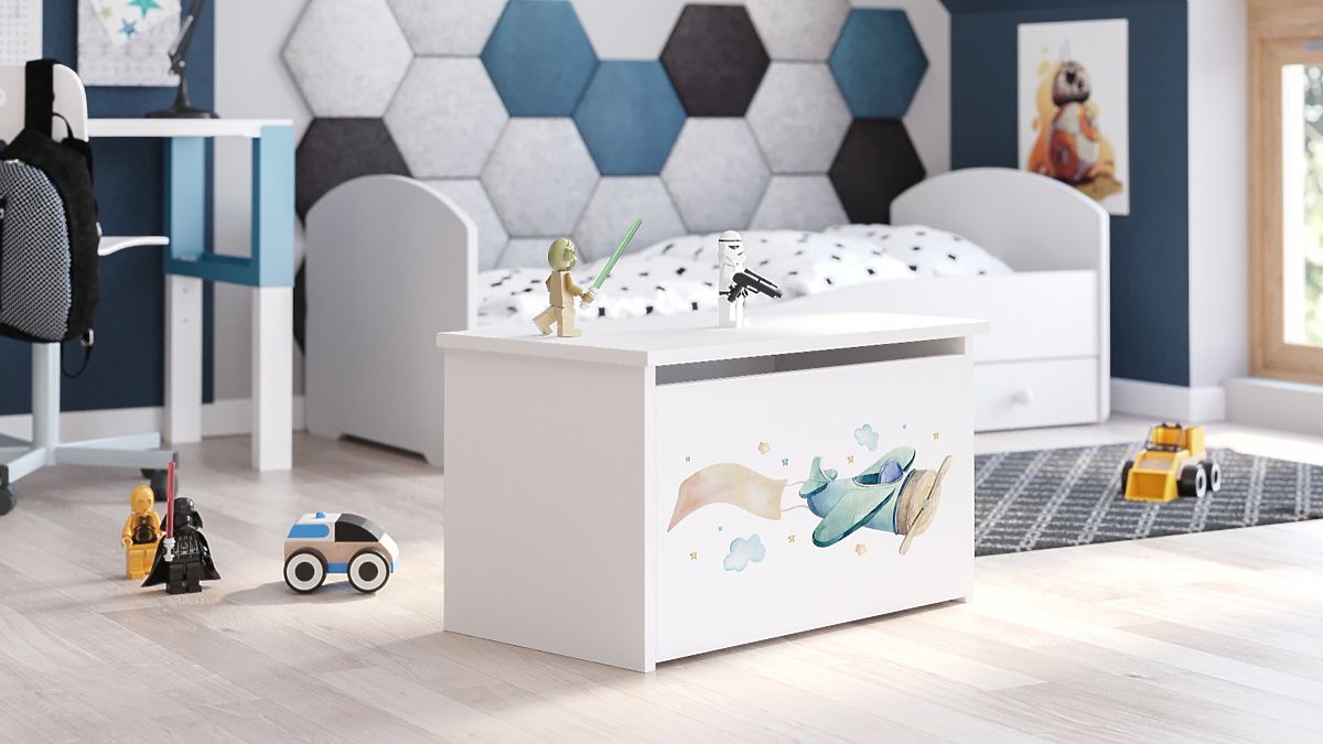 Babynabytek.cz » Dětský nábytek / Komody a skříně / Truhly na hračky / Truhla na hračky Daria bílá s potiskem Letadlo