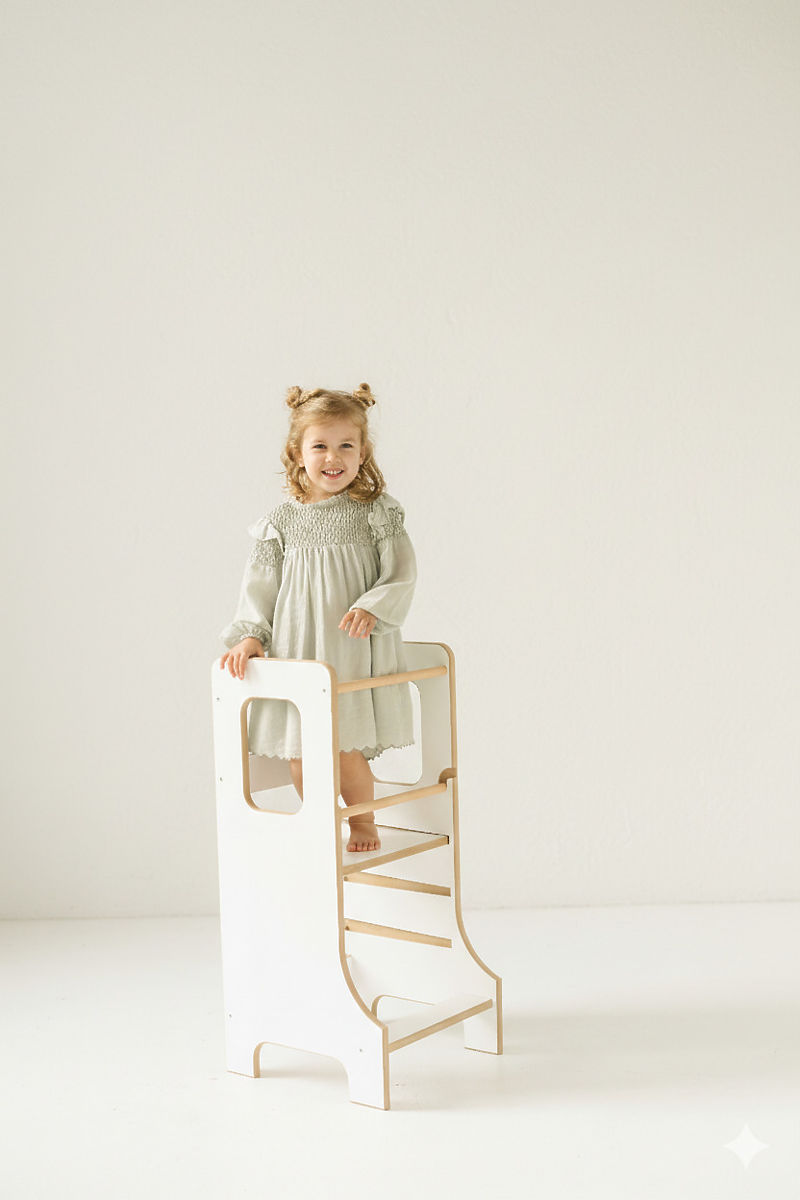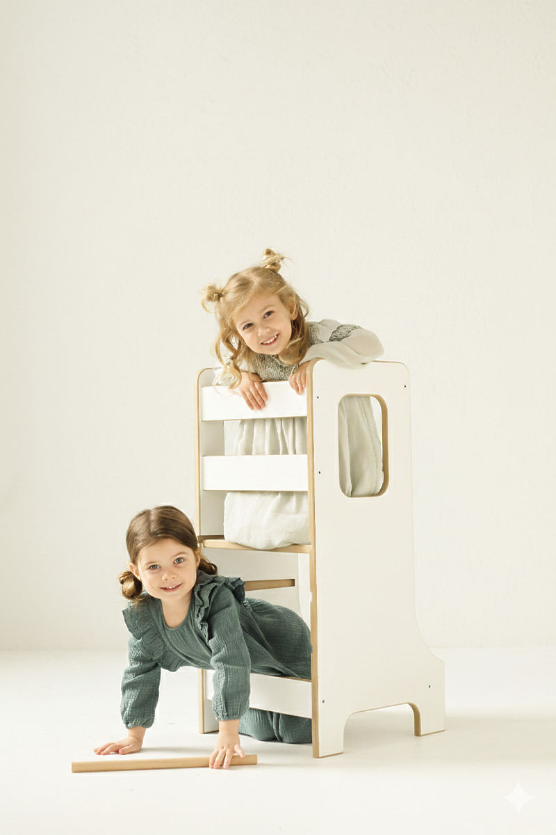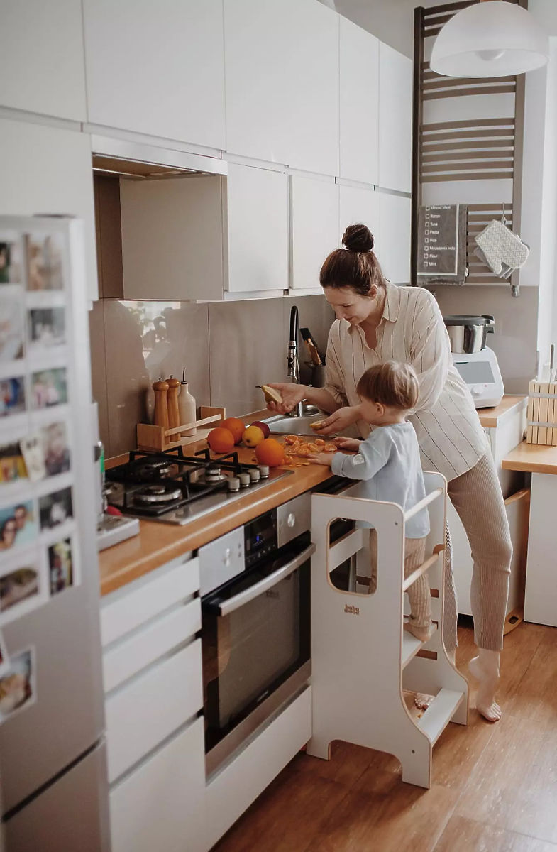 Učicí věž SLIM v bílé barvě je ideální volbou pro rodiče, kteří chtějí děti bezpečně zapojit do běžných domácích činností a umožnit jim aktivně objevovat okolní svět. Díky své promyšlené konstrukci podporuje samostatnost, kreativitu i rozvoj motorických dovedností a pomáhá dětem přirozeně získávat nové zkušenosti. Společné chvíle strávené u vaření nebo jiných aktivit se tak promění v zábavné a hodnotné okamžiky. Štíhlé provedení verze SLIM působí elegantně a nezabírá zbytečně mnoho místa, přesto zůstává stabilní a bezpečné. Děti mohou do věže samostatně vylézt i z ní bezpečně slézt, což posiluje jejich sebevědomí a nezávislost.