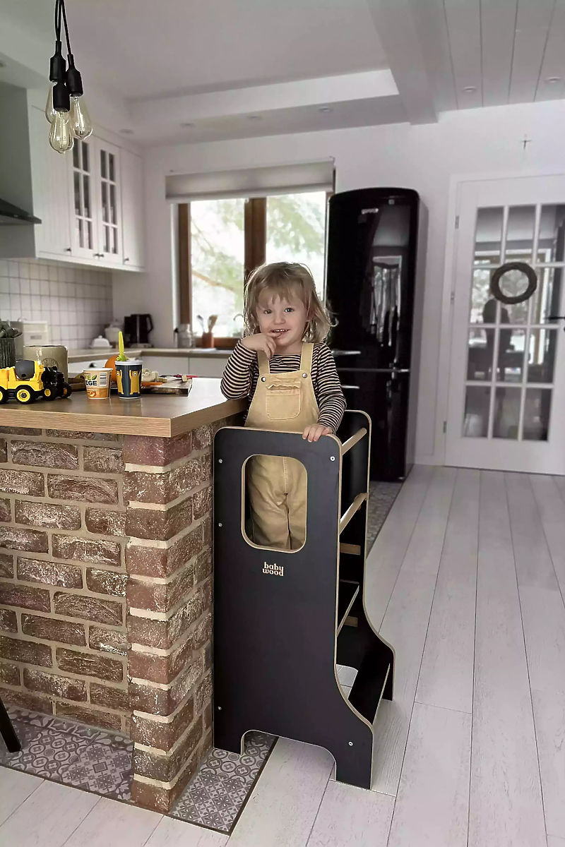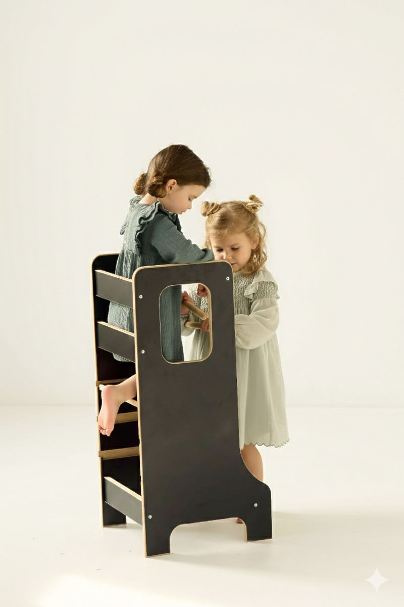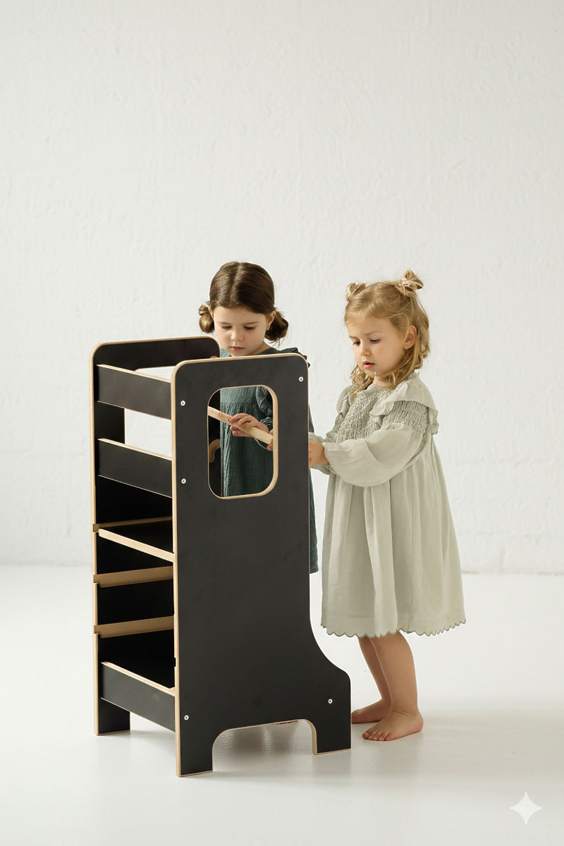 Učicí věž SLIM v černém provedení je stylovým a praktickým pomocníkem pro rodiny, které chtějí děti bezpečně zapojit do každodenních domácích aktivit. Umožňuje dětem stát ve správné výšce, pozorovat dění kolem sebe a aktivně se podílet na běžných činnostech. Zároveň podporuje rozvoj samostatnosti, motoriky i sebevědomí dítěte. Díky štíhlému designu se věž snadno začlení do moderních interiérů a nezabírá zbytečně mnoho prostoru. Stabilní konstrukce a promyšlené bezpečnostní prvky zajišťují pohodlné a bezpečné používání.