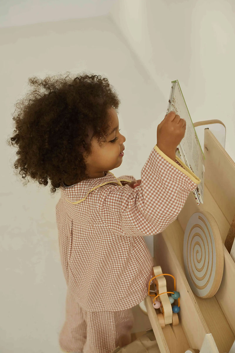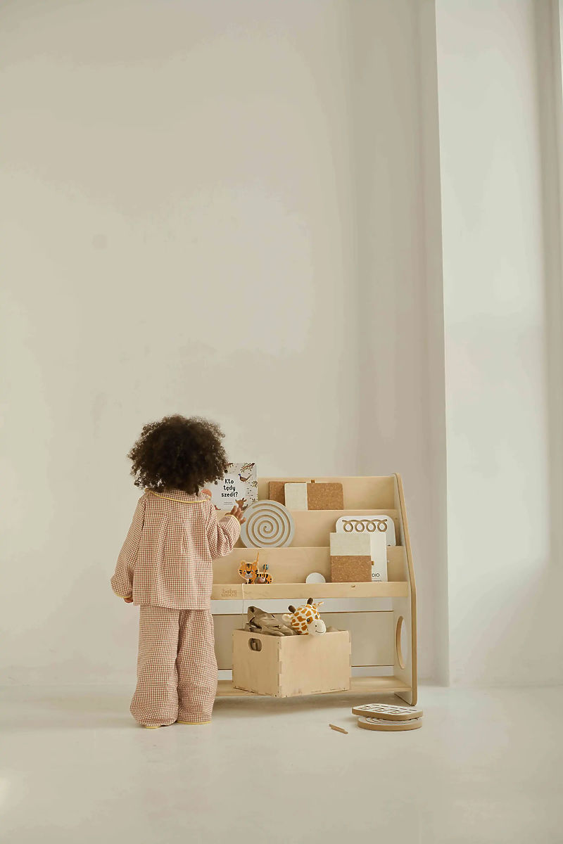 Dřevěný regál je praktickým a estetickým řešením pro uspořádání dětského pokoje. Kombinuje jednoduchý design s vysokou funkčností a splňuje principy Montessori, které podporují samostatnost dítěte. Díky otevřenému provedení má dítě snadný přístup ke knihám i hračkám a může si je samo ukládat na své místo. Regál umožňuje vystavení knih obalem směrem dopředu, což je ideální zejména pro menší děti, které ještě neumí číst – oblíbenou knížku snadno poznají podle obrázku. Tři knihovnické police pojmou knihy různých velikostí a spodní část nabízí další úložný prostor pro hračky, puzzle nebo deskové hry.