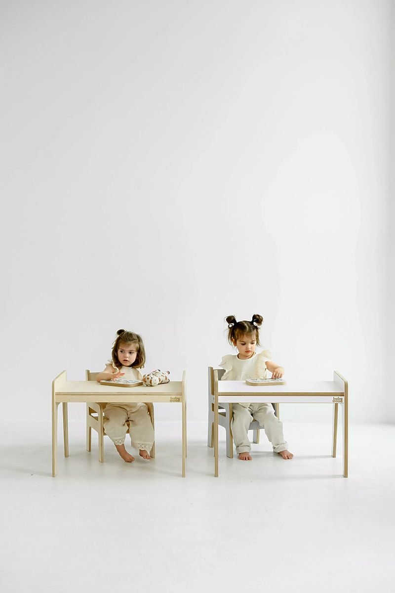 Zestava stolečku a židličky je ideálním řešením pro malé objevitele a kreativní duše. Byla navržena s důrazem na pohodlí, bezpečnost a svobodu pohybu při hraní, kreslení i učení. Minimalistický tvar, nadčasový design a přírodní materiály dělají ze setu krásný a funkční prvek dětského pokoje. Zaoblené hrany a stabilní konstrukce poskytují maximální bezpečí, zatímco správná výška nábytku podporuje samostatnost dítěte a zdravé sezení.