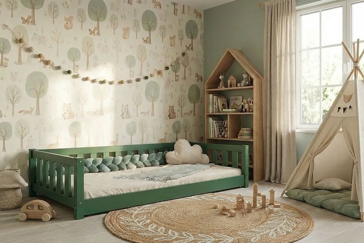 Moderní dětská postel Montessori Meadow v zelené barvě, navržená dle základních principů Montessori, zaujme všechny rodiče, kteří chtějí podpořit samostatnost a nezávislost svých dětí. Tato nízká postel se zábranou nabízí bezpečné a pohodlné prostředí pro hru, denní odpočinek i noční spánek. Nadčasový design a použití borovicového dřeva působí v každém dětském pokojíčku esteticky příjemně a vytváří v něm harmonický prostor pro přirozený rozvoj dětí.