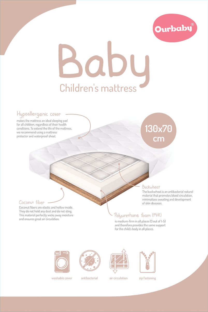 Dětská matrace BABY o rozměru 70x130 cm vhodná pro citlivou dětskou pokožku. Oboustranná matrace složená ze 3 vrstev (pohanka, PUR pěna, kokos). Spánek na straně s pohankou nebo na straně z kokosu? Děti si mohou vybrat, která strana jim je pohodlnější nebo dle ročního období. Matraci stačí jednoduše otočit.