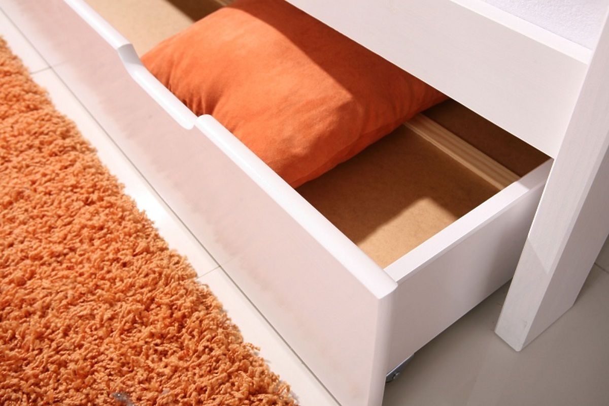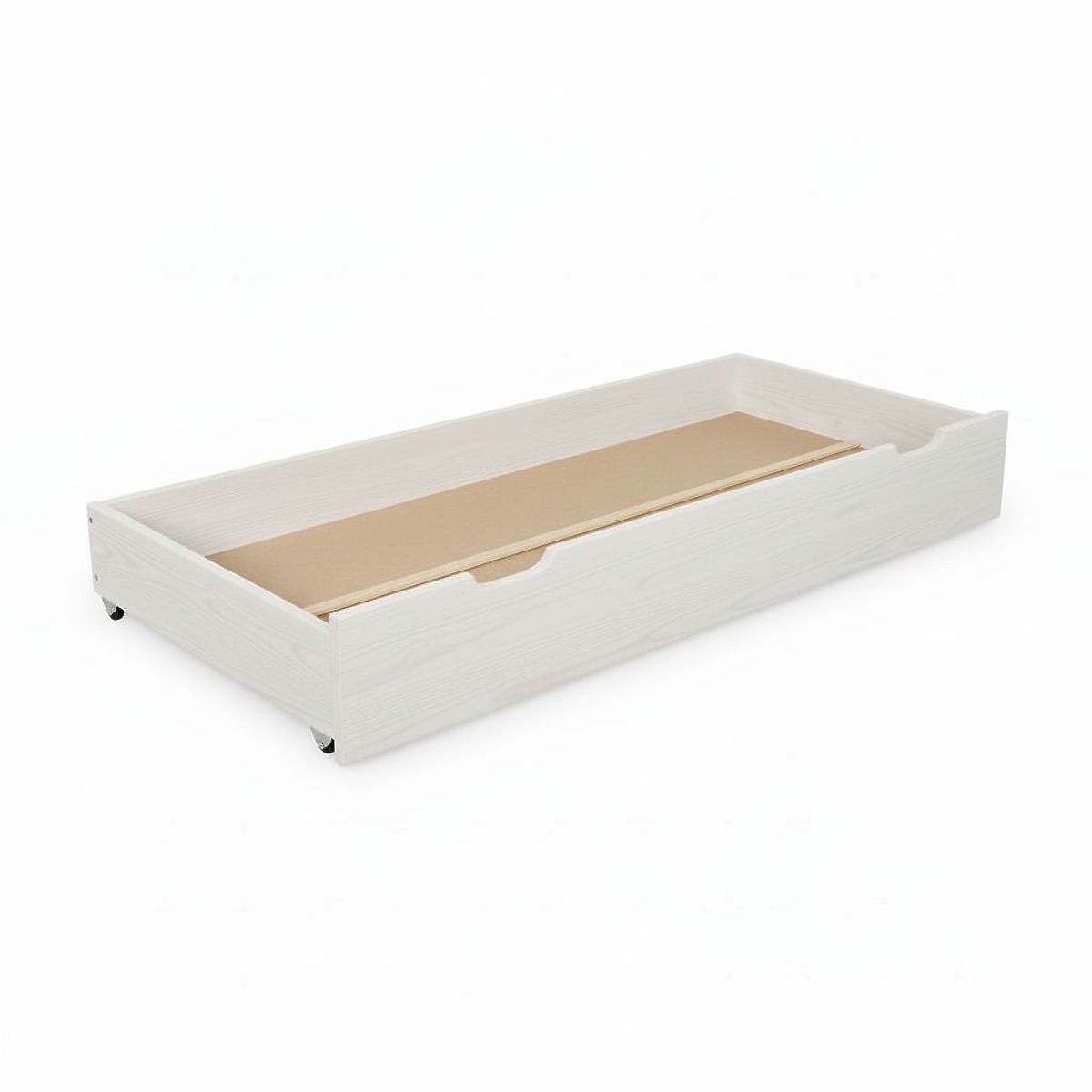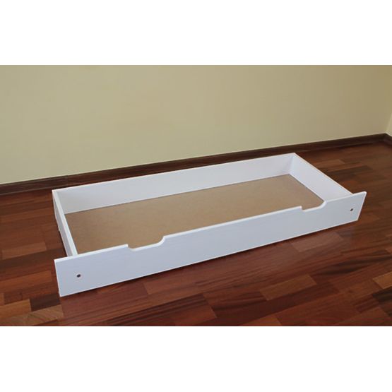 Bílý šuplík pod postel Paul, vyroben z borovicového dřeva, lakovaný dvěma vrstvami laku polomat. Šuplík je velmi kvalitně vyroben, záruční doba 24 měsíců.