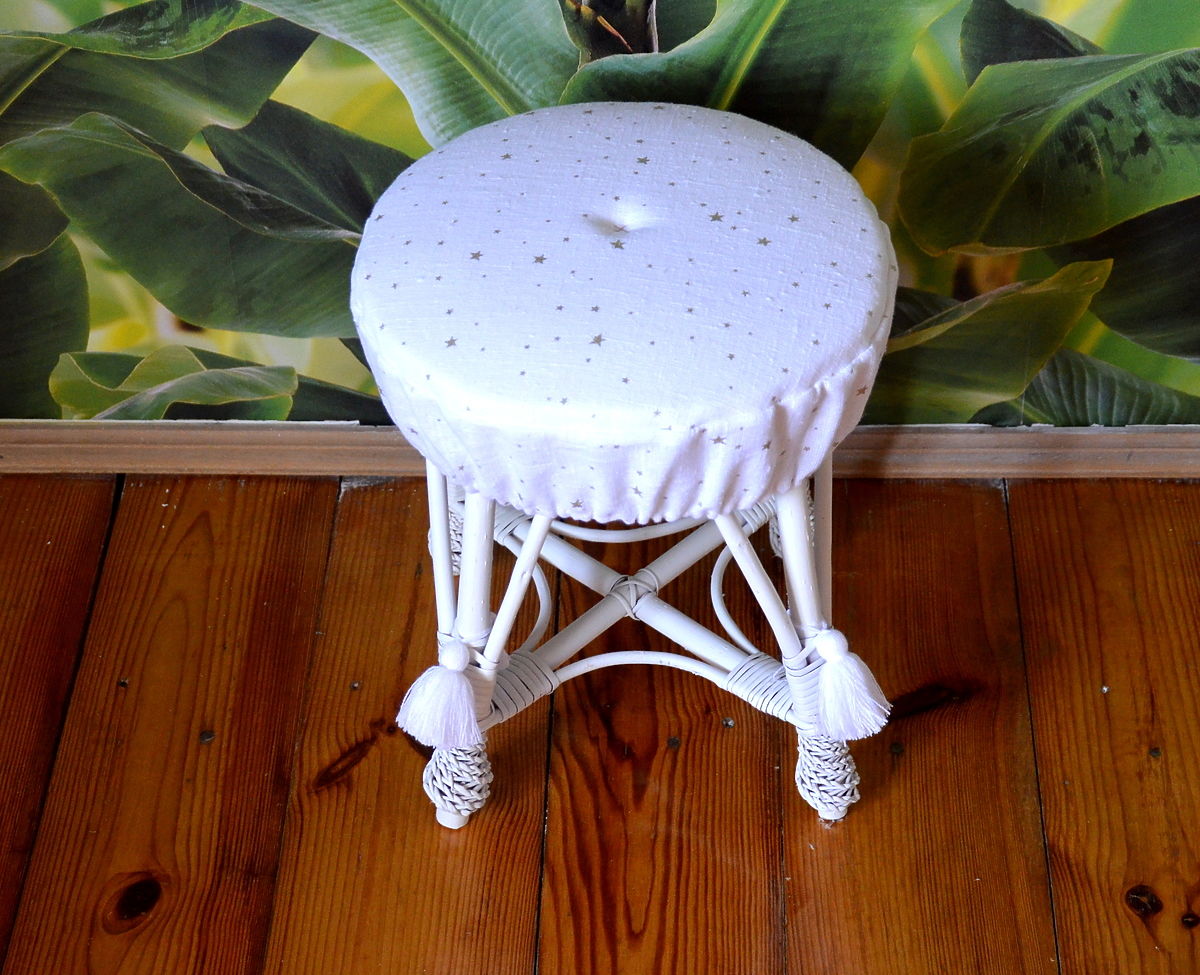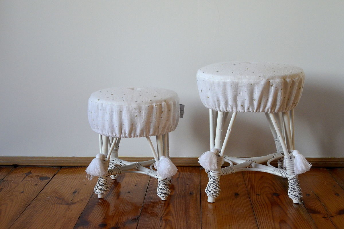 Proutěný taburet, který se vyznačuje vysokou pevností a odolností proti poškození. Natřené na bázi vodní barvy, bez přídavku rozpouštědla, takže je bezpečný pro děti a životní prostředí.