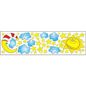 Sluníčko, měsíc, hvězdičky o rozměru 0,3 metrů čtverečních. Soubor dekorace tvoří samolepky sluníčka, měsíce, hvězdiček a mráčků.